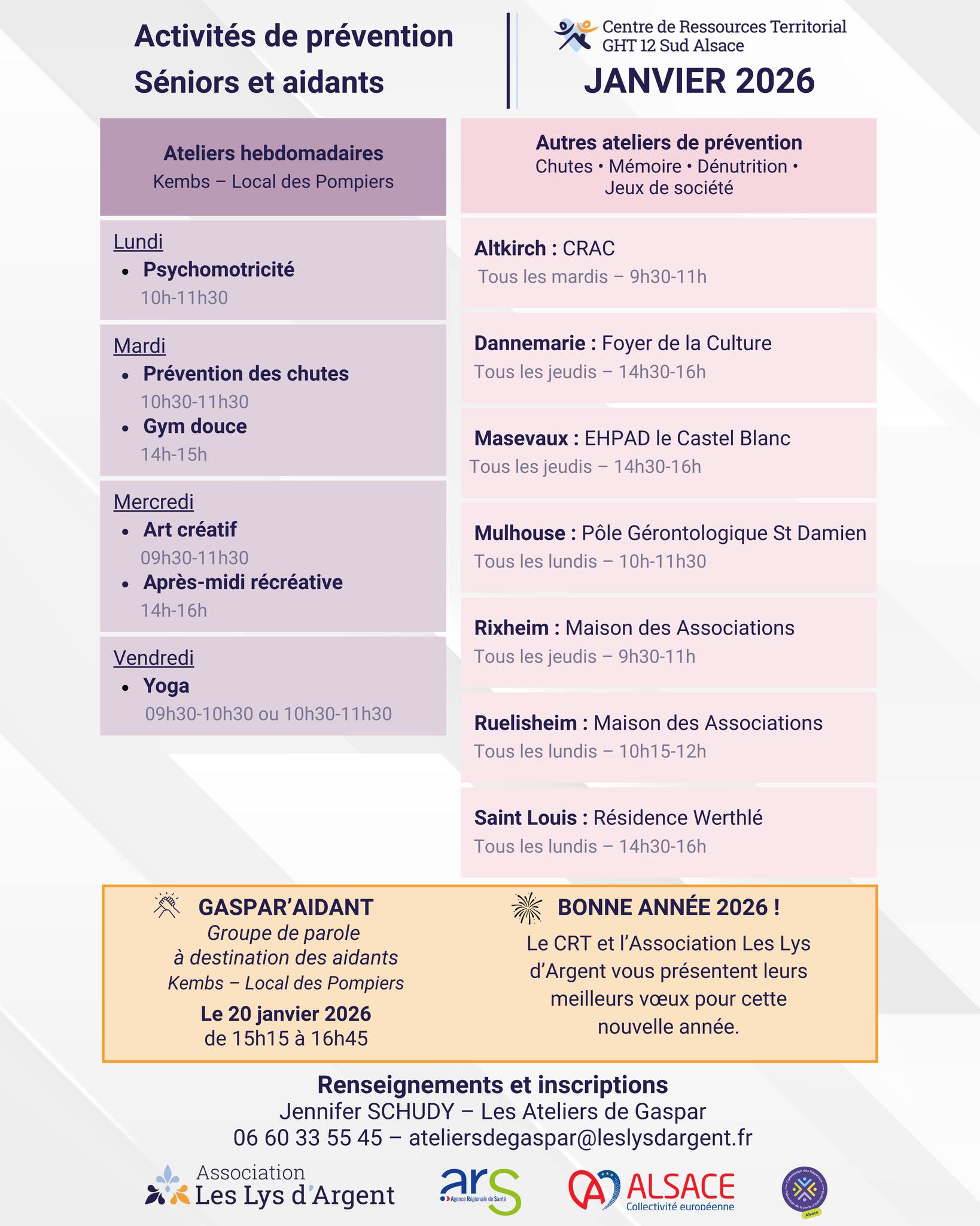 Découvrez le programme d’activités du CRT GHT 12 Sud Alsace pour le mois de janvier 2026 !Notre Centre de Ressources Territorial s’engage pour prévenir la perte d’autonomie et encourager le bien vieillir à domicile. Dans cette dynamique, des ateliers hebdomadaires variés sont proposés pour favoriser le bien-être, la santé et le lien social. Groupe de parole GASPAR’AIDANTAidants, rejoignez-nous le 20 janvier 2026 au local des pompiers de Kembs autour d’un temps d’écoute et de soutien, spécialement dédié à ceux qui accompagnent au quotidien. Un mois de rendez-vous conviviaux vous attend, à vivre pleinement et à partager autour de vous. Rejoignez-nous, parlez-en à vos proches, et prenez part à ce bel élan collectif ! Pour toute information, contactez Jennifer SCHUDY des Ateliers de Gaspar :06 60 33 55 45 | ateliersdegaspar@leslysdargent.fr