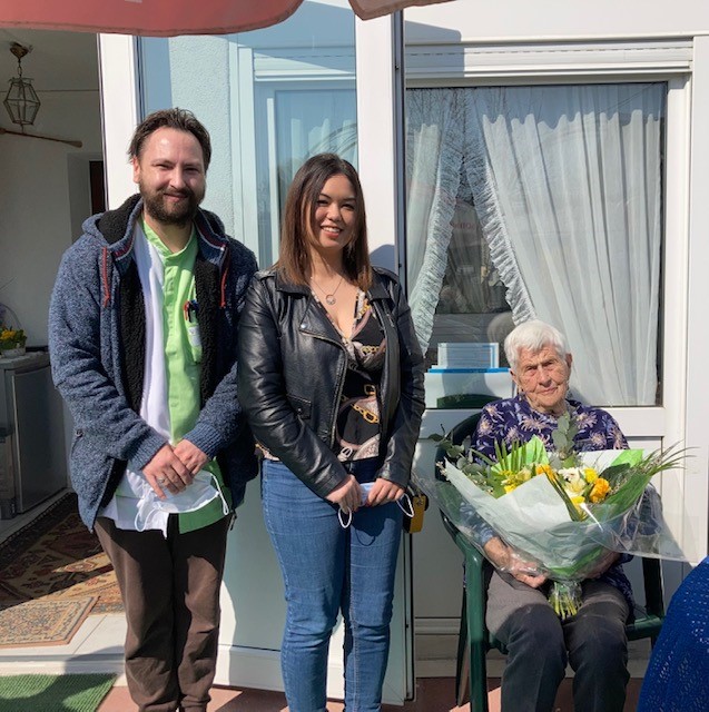 Pour l'occasion, Mélissa (Assistance SSIAD/SAAD et aide-soignante) accompagnée de Jonathan (aide-soignant), sont allés porter un bouquet de fleurs à la bénéficiaire.