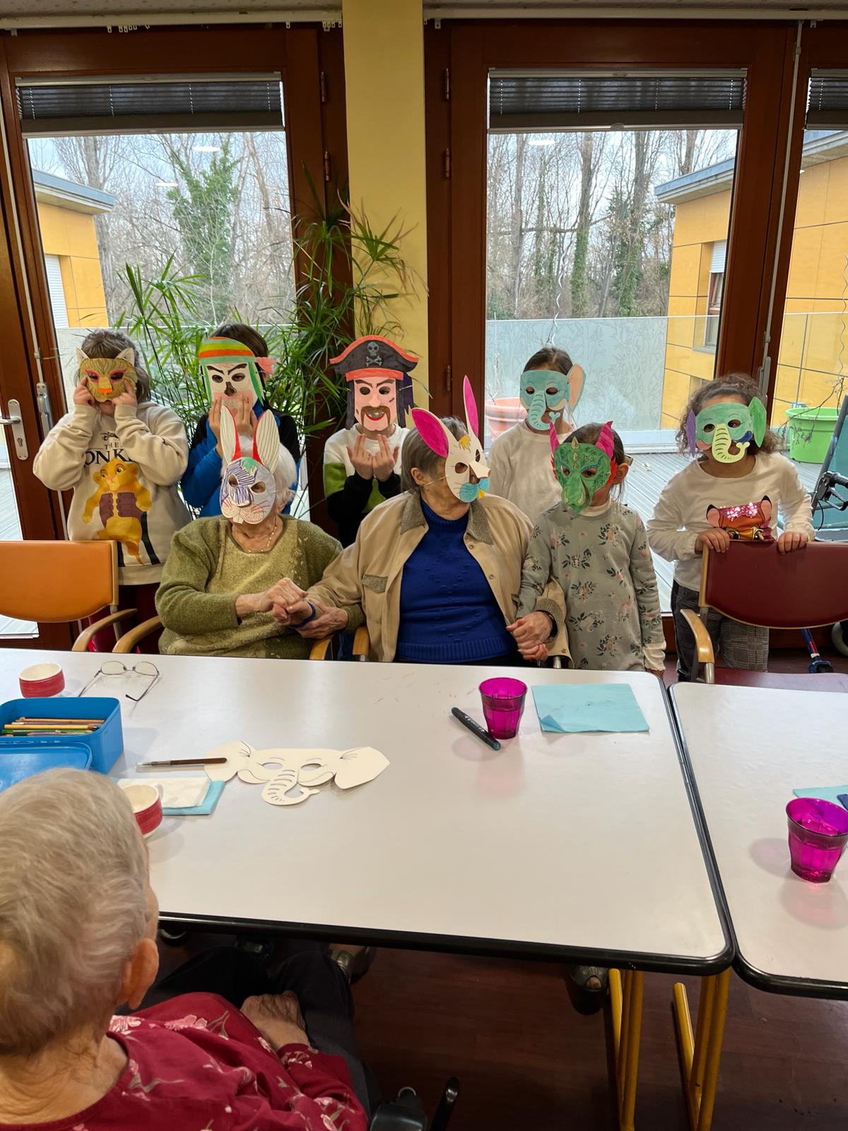 Pour carnaval, les enfants du périscolaire Association La Clef de Bartenheim ont créé des masques avec les résidents de l'EHPAD sur Saint-Louis site de Blanche de Castille.