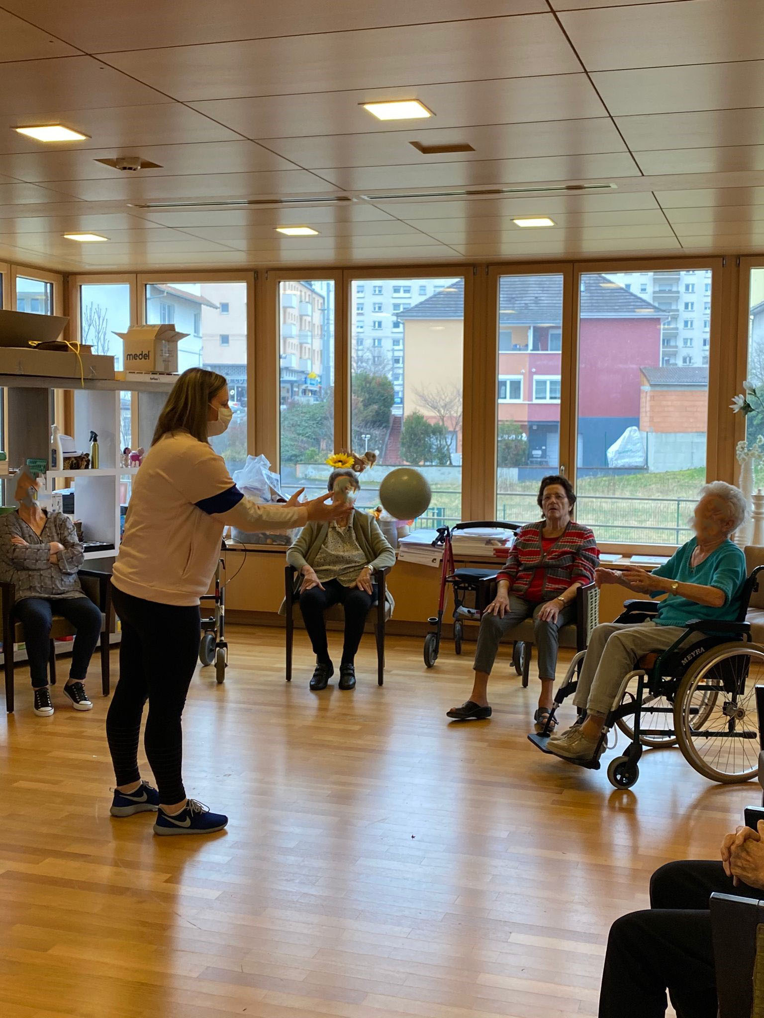 Tous les vendredis, pendant 1h certains résidents de la Maison du Lertzbach réalisent de la Gym douce avec leur professeur, Ophélie.