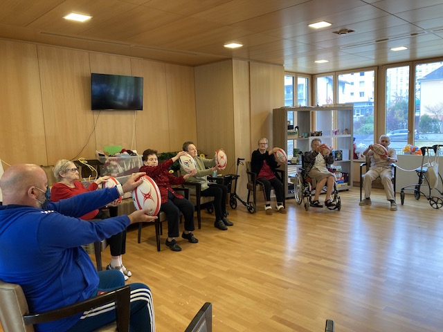 Lors de cet atelier les résidents réalisent différents exercices avec un ballon de rugby.